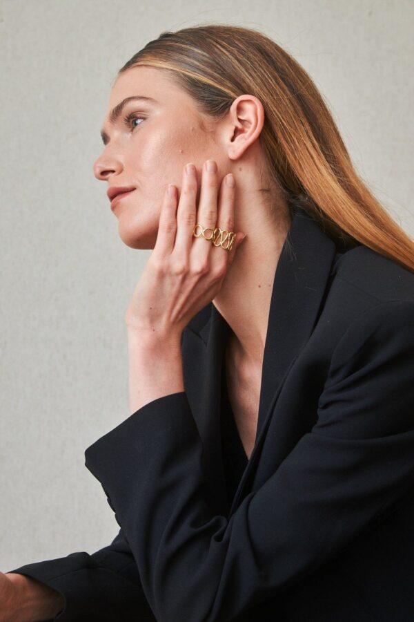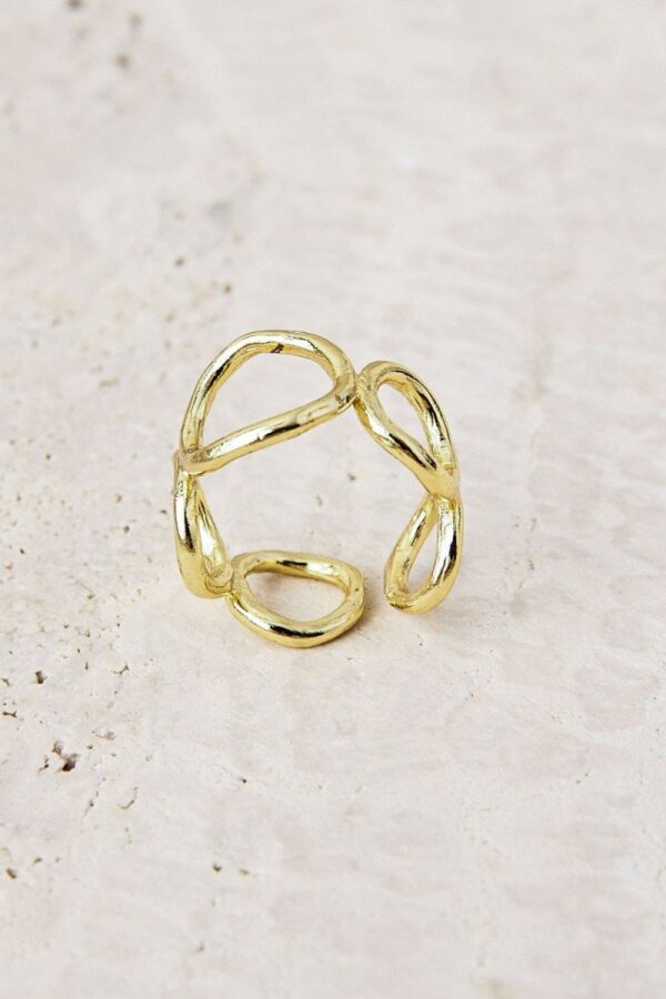 Anillo abierto de latón bañado en oro con diseño calado de líneas orgánicas. Una pieza versátil y ligera, perfecta para llevar sola o combinada con otros anillos.