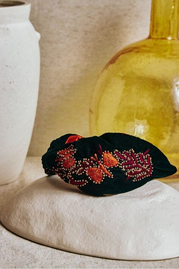 Inspirada en los bordados tradicionales, esta pieza de terciopelo se convierte en un homenaje artesanal. Las flores en tonos cálidos, bordadas a mano con hilo y resina, florecen sobre una base verde intensa. Una diadema pensada para mujeres que valoran los detalles con alma.