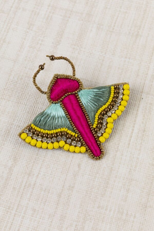 Este broche mariposa, bordado en hilos de diferentes tonos, aporta textura y personalidad a cualquier look. Ideal para transformar una chaqueta, un vestido o un bolso con un detalle creativo y lleno de carácter.