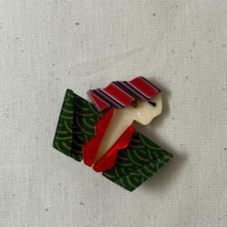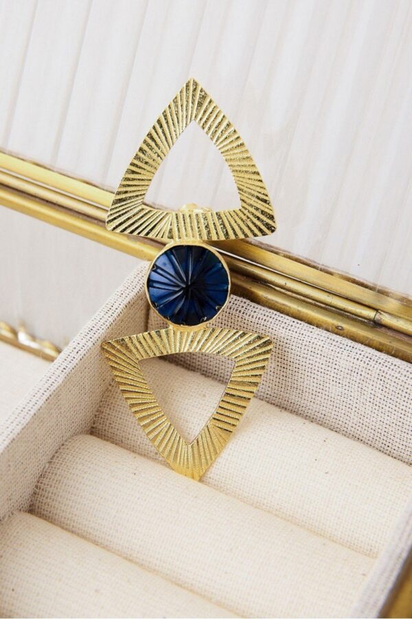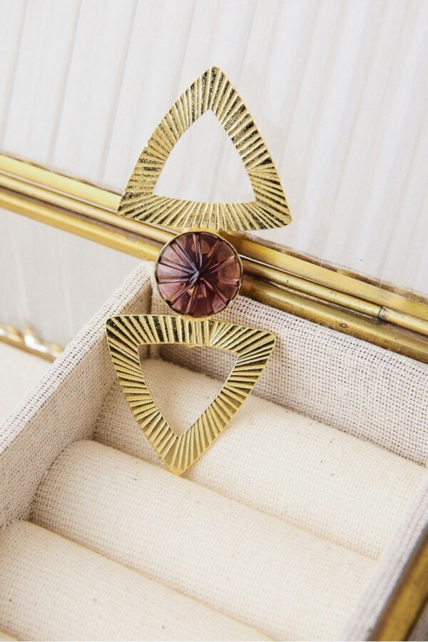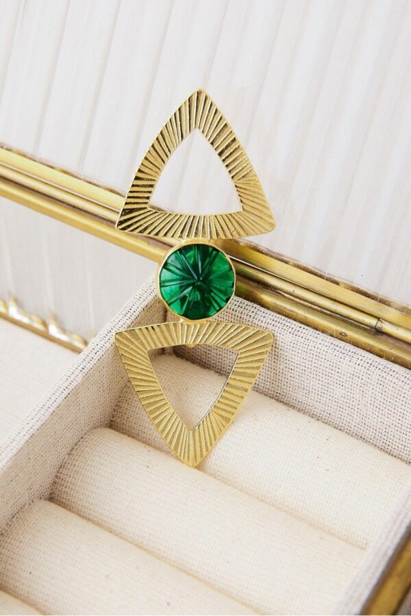 Broche de latón con baño de oro y piedra semipreciosa tallada en el centro. Un diseño estructural y elegante que aporta carácter a cualquier look, ideal para complementar prendas de abrigo o darle un toque especial a tus accesorios