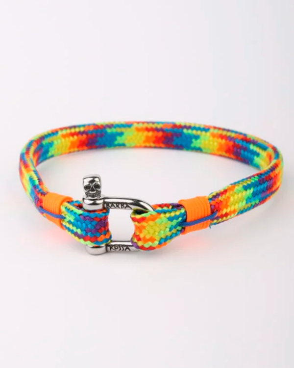 Pulsera embutida multicolor y remate naranja con grillete de acero inoxidable Garantía de 3 años.