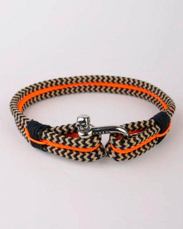 Pulsera náutica fabricada de forma artesanal en Menorca en colores navy y beige y acabado en naranja , una fusión de estilo y resistencia. Fabricada con cabo náutico de alta tenacidad, garantiza durabilidad y un ajuste cómodo. Su cierre en grillete de acero inoxidable con nuestra calavera Barba-Rossa aporta un toque robusto y sofisticado, evocando el espíritu aventurero del mar. Perfecta para quienes buscan un accesorio versátil, resistente al agua y al paso del tiempo. Además, cuenta con una garantía de 3 años, asegurando su calidad y fiabilidad .
